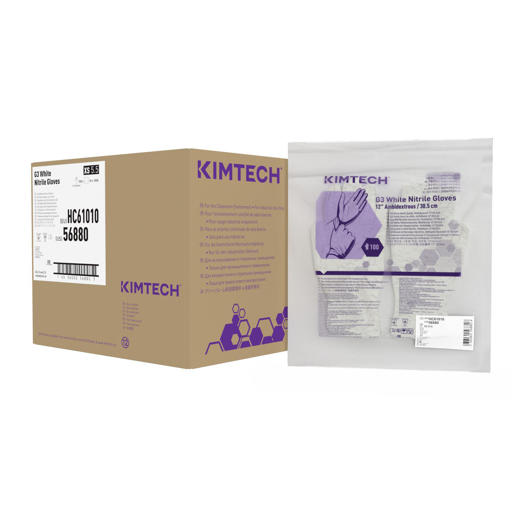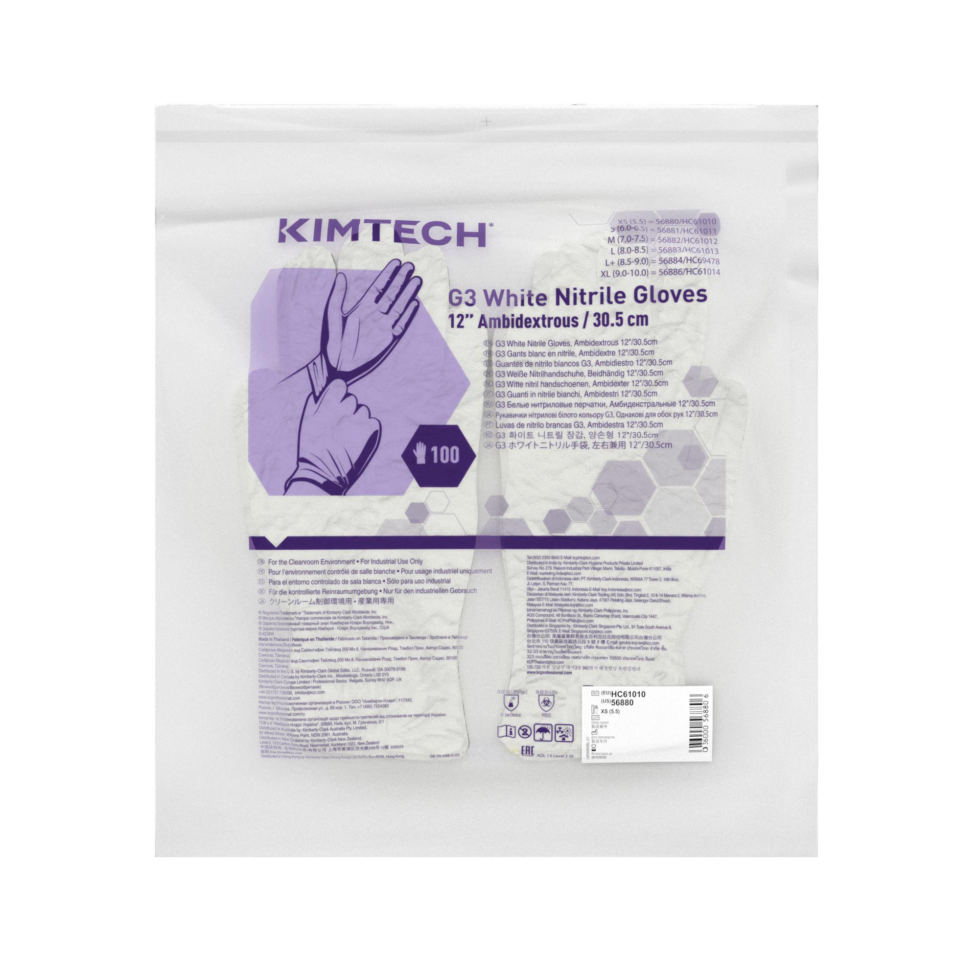 Kimtech™ G3 White Nitrile Ambidextrous Gloves are ideal for handling delicate equipment in microelectronics, semiconductor, optics and non-sterile pharmaceutical applications; when the highest levels of sensitivity, protection and performance are required. The high quality nitrile gloves deliver seamless protection when and where it is needed and are suitable for ISO Class 3 or higher cleanroom environments. The nitrile polymer material is designed for fit and reliability, with textured fingertips for improved grip and excellent water tightness with a low risk of pinholes. The gloves are ambidextrous and incorporate a beaded cuff for added strength and ease of donning, so the wearer can simply grab and go without any fear of ripping the material. Our non-sterile nitrile cleanroom gloves are also latex, silicone and powder-free. The absence of natural rubber latex reduces the risk of TYPE 1 glove-associated reactions, protecting the wearer as well as the application. During manufacture the gloves are washed repeatedly in ultrapure deionised water to ensure consistent control of particles and extractables. The gloves are designated as PPE Cat III according to (EU) Regulation 2016/425 and to the Regulation 2016/425 as brought into UK law and amended. Gloves are provided double-bagged in cleanroom-compatible polyethylene and case liner so as to be easily integrated into your processes. Available Sizes/Codes: XS – 56880 (Formerly HC61010); S – 56881 (Formerly HC61011); M – 56882 (Formerly HC61012); L – 56883 (Formerly HC61013); XL – 56886 (Formerly HC61014)