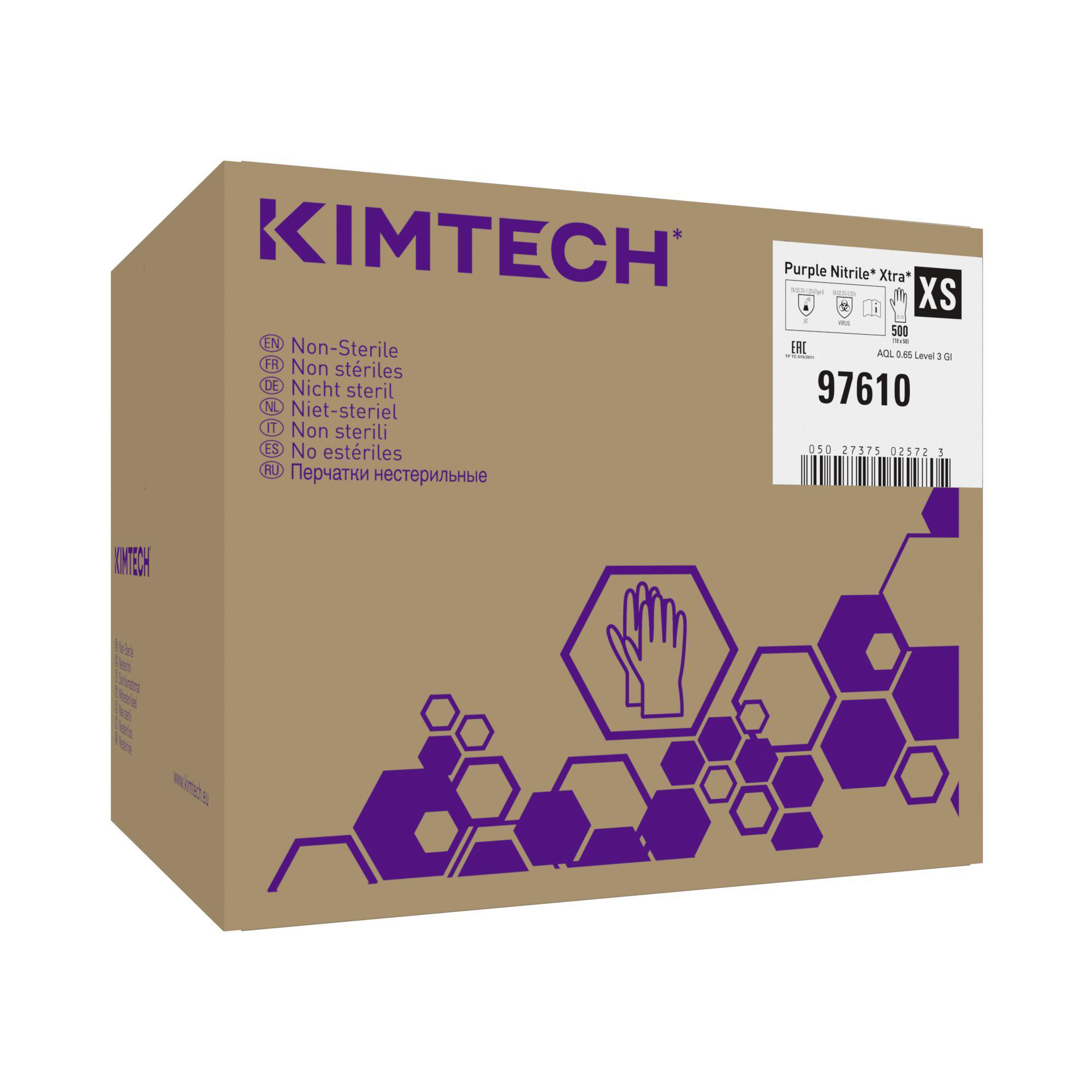 Kimtech™ Purple Nitrile™ Xtra™ Ambidextrous Gloves deliver market-leading protection suitable for challenging life sciences and pharmaceutical manufacturing environments. The high quality nitrile material delivers seamless protection whenever and wherever it is needed. The synthetic nitrile polymer material (Acrylonitrile Butadiene) is designed for fit and reliability, with textured fingertips for improved grip and excellent water tightness (AQL 0.65) that results in a low risk of pinholes. The gloves are ambidextrous and incorporate a beaded cuff for added strength and ease of donning, so the wearer can simply grab and go without any fear of ripping the material. Our nitrile safety gloves are latex-, silicone- and powder-free. Kimtech™ Purple Nitrile™ Xtra™ Ambidextrous Gloves also feature added length for extra protection. Our Kimtech™ Purple Nitrile™ Xtra™ gloves are designed to keep hands and wrists comfortable and protected while ensuring that research applications can be carried out contamination-free. The gloves are designated as PPE Cat III according to (EU) Regulation 2016/425, and are ideal for use in higher-risk applications, as well as being food contact approved. Available Sizes/Codes: XS - 97610, S - 97611, M - 97612, L - 97613, XL - 97614.